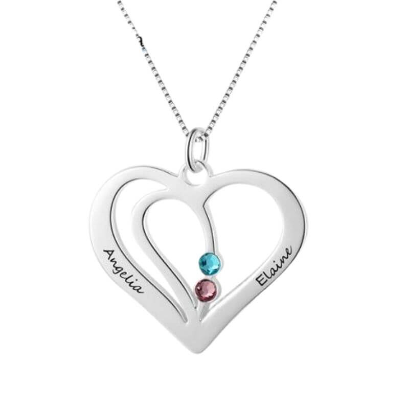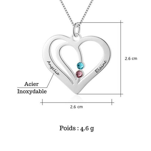 - Pendentif représentant 2 cœur entrelacés personnalisable avec les prénoms et la pierre de naissance de chacun