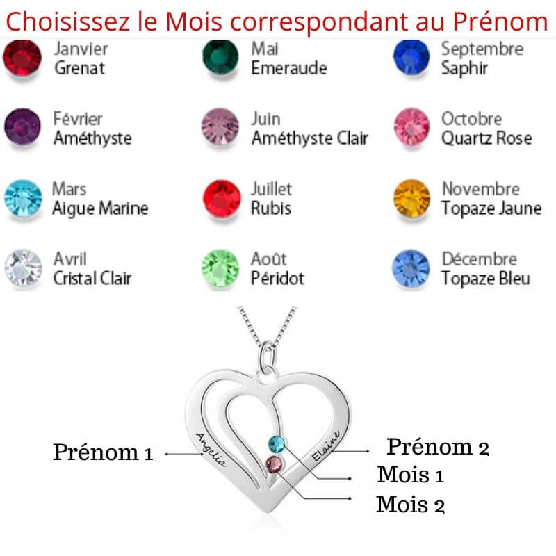Associez le Prénom et la pierre de naissance correspondante à votre couple pour réaliser un magnifique Collier en forme de Cœur unique et personnel